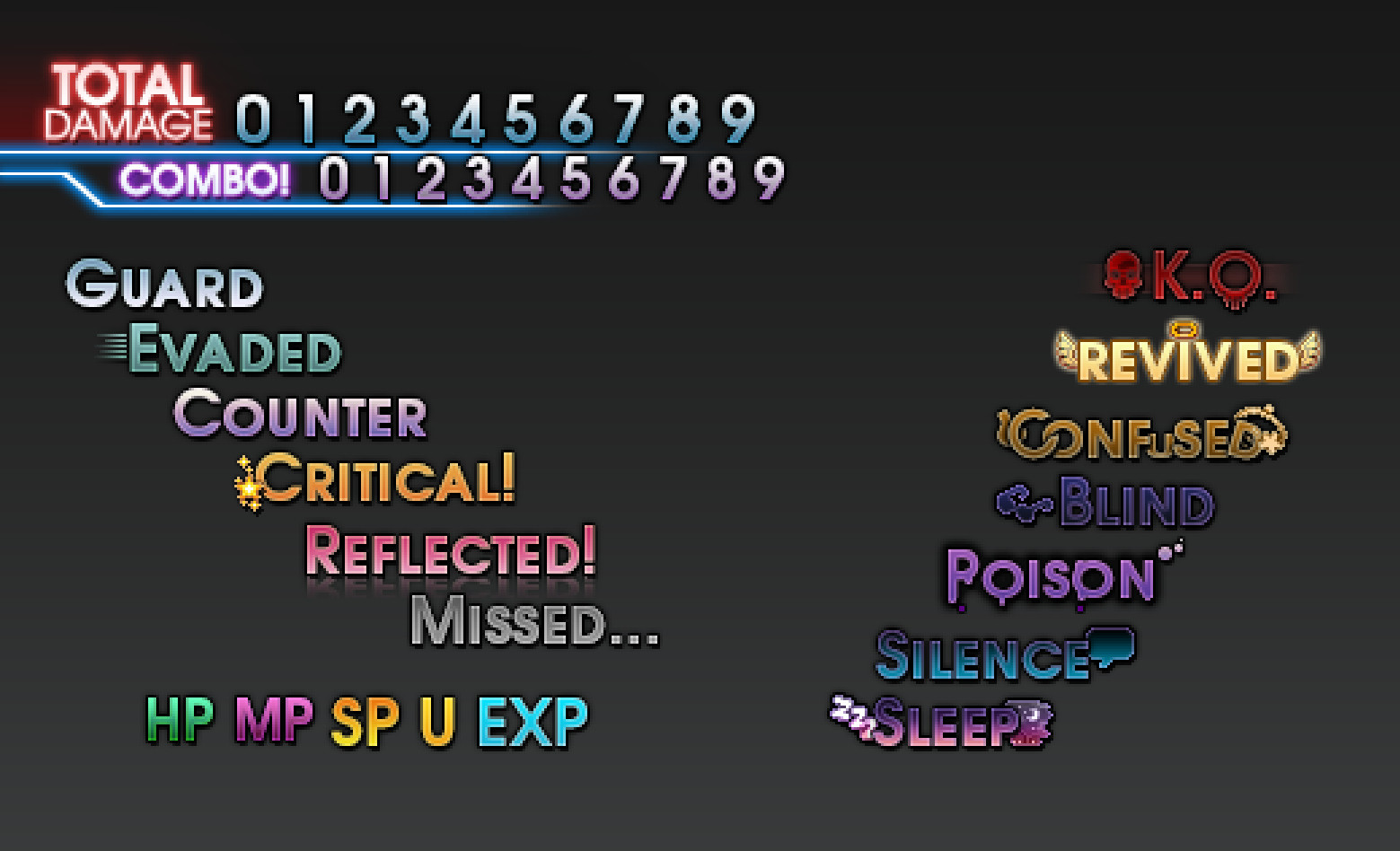 Next update to battling Nightmares, several UI updates have been made. The Combo and Damage HUD has been updated, as well as the HP/MP numbers on the player's battle hud. States no longer pop up as just plain text; flavorful images pop up in place of the old text, to add personality to each state! Here's a preview of some of the changes: