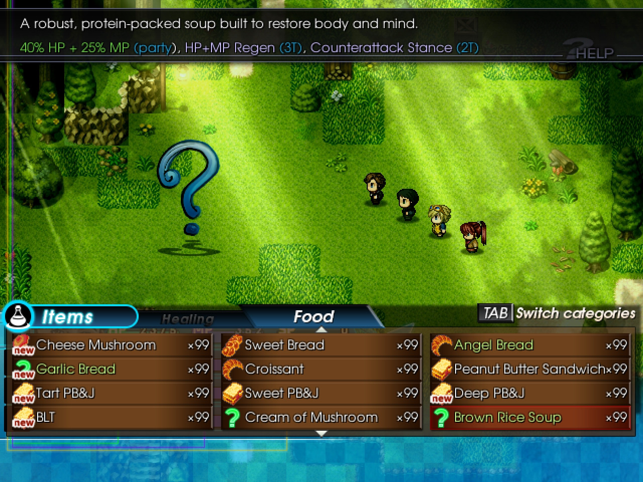 Pretty nice, huh? OH! Speaking of "flavorful", food items have been moved to their own togglable item tab in battle! This is a recent update to the battle system. By pressing TAB on your keyboard, you'll be able to switch between regular items and food items.