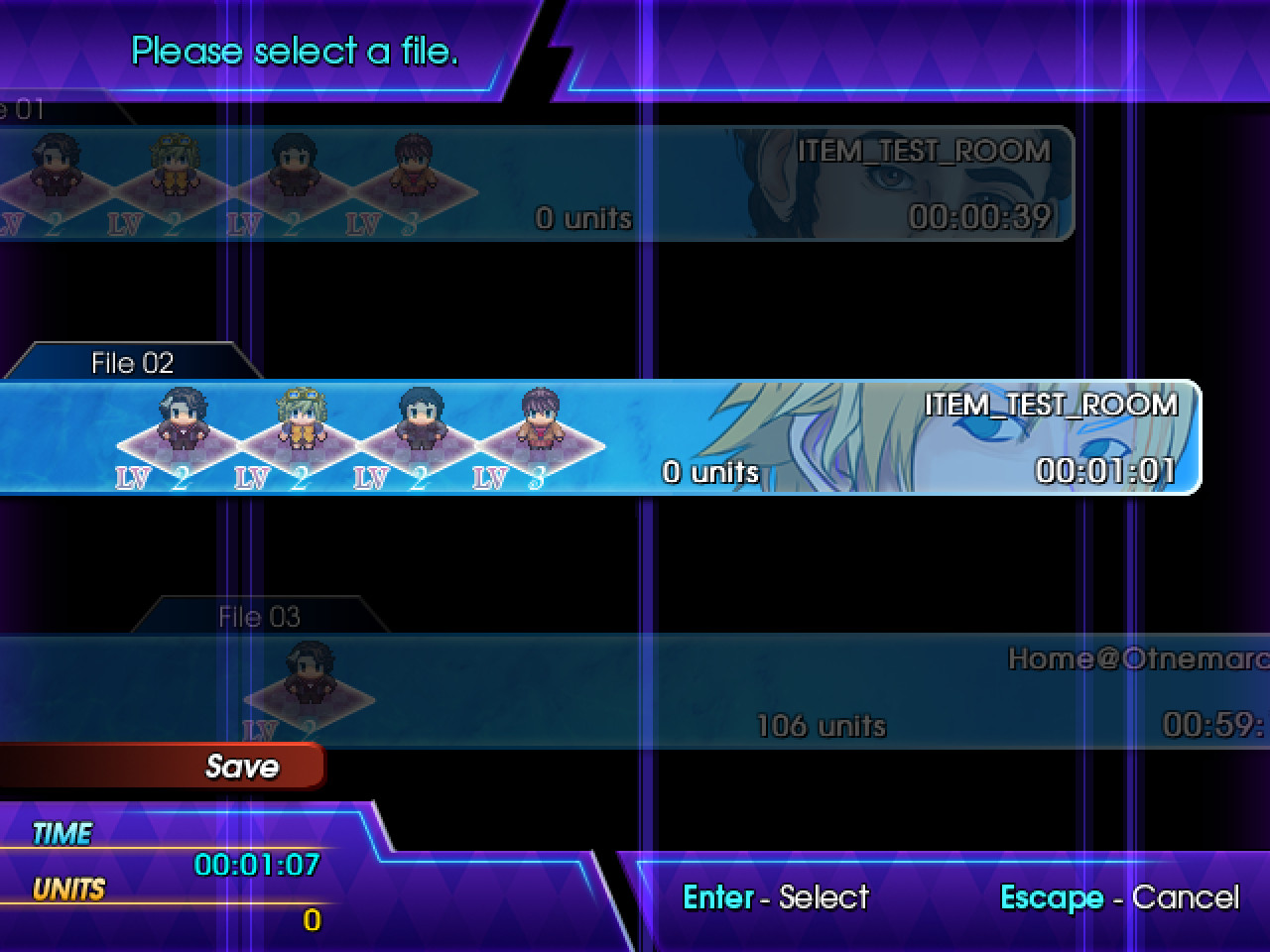 No more industrial metal-gray rectangle that just says SAVE on it, finally we have something NICE! Next, the save menu itself has been updated to reflect play time, current units, and something a little extra. This is still a WIP, but the changes include a face on each save file depending on how far you are in the game. Each chapter completed changes the face on the save file. I'm testing adding a golden glow to a save file that has been completed, but I'll save that for those who complete the game for now.