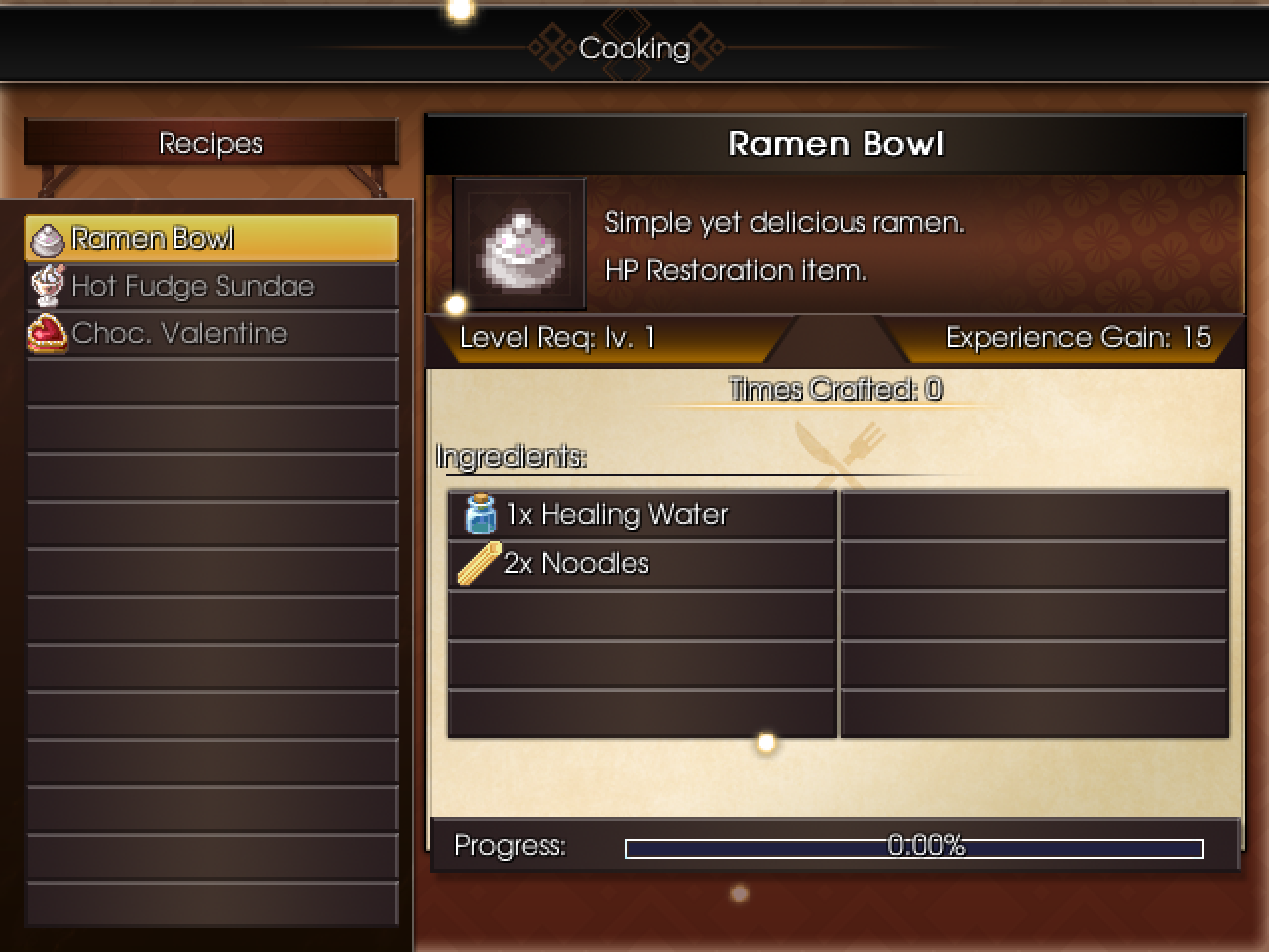 The cooking menu UI has been improved upon as well, with a nice color scheme, unique particles, unique windowskin for the toast message, and new variables to keep track of the player's "favorite" dish and successful dishes made overall. Certain NPCs will now comment on this!