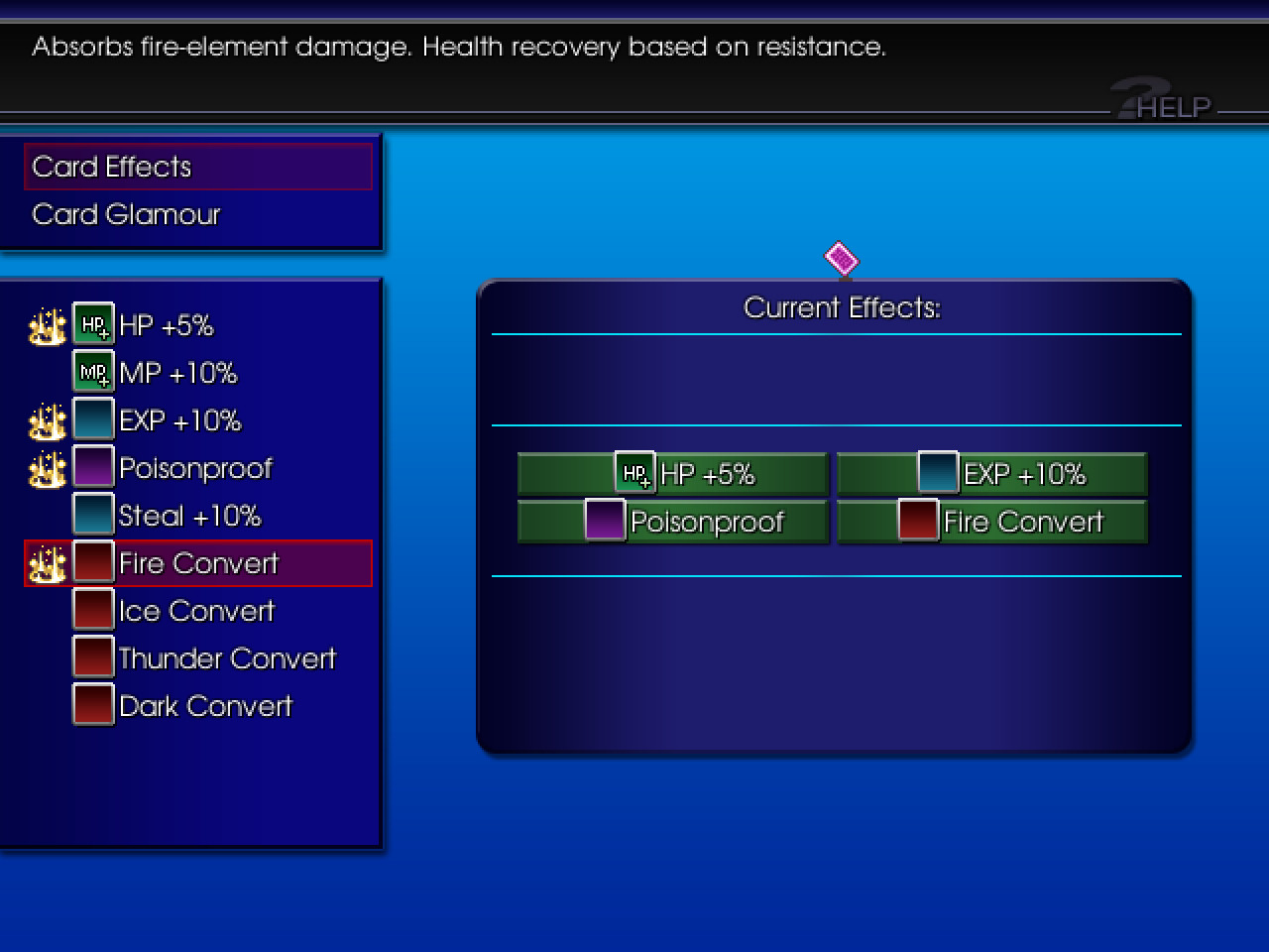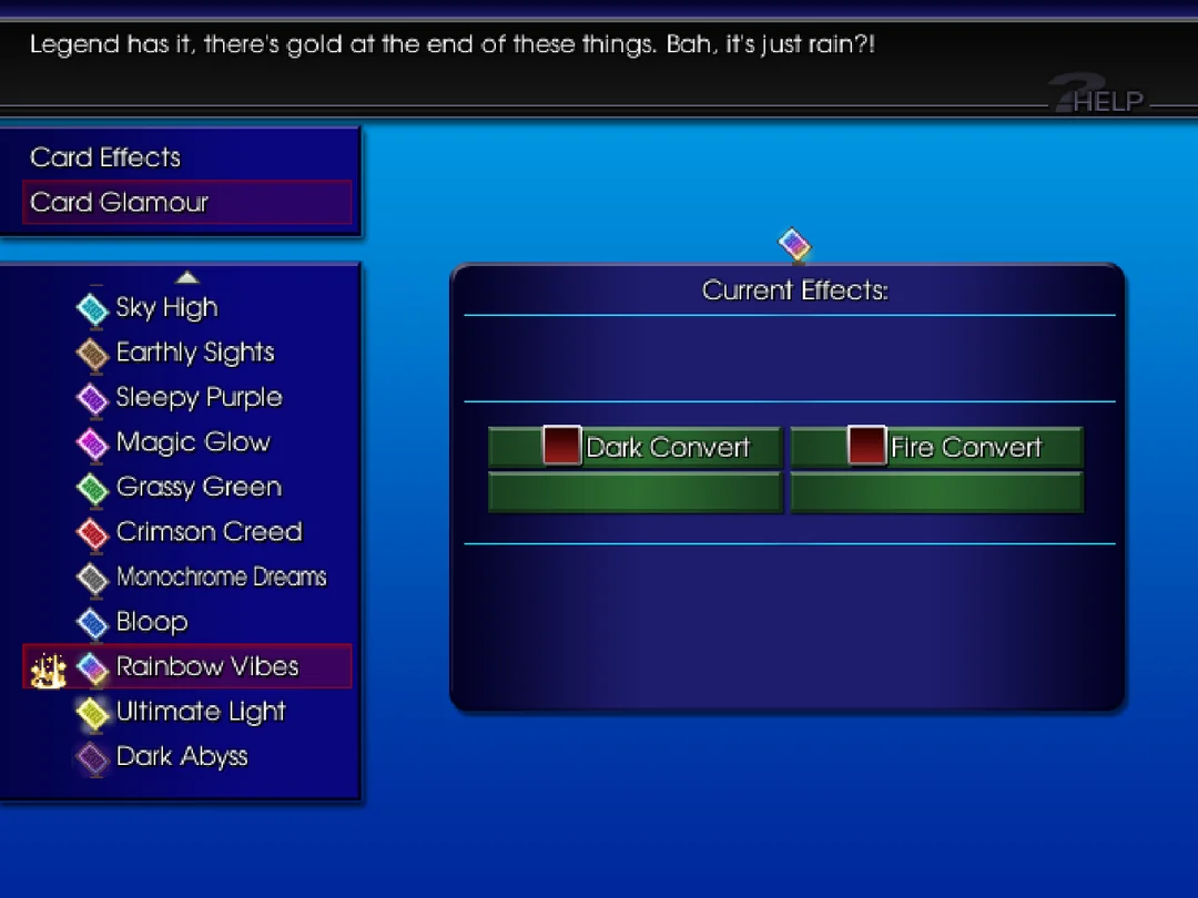 With this screen, the player can choose various effects to add or remove to their particular card. As you play through the game, you may unlock a multitude of effects, as well as Card Glamour, which allows you to change the icon of the card as well!