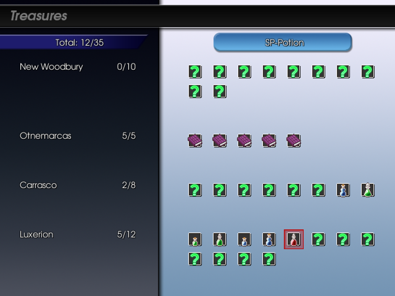 First, the treasure list will show which chests have been found and which ones haven't. This will tally up in the top-left corner of the menu. Each chest upon opening will keep the contents listed on the top. This of course means I'll be removing the multiple-quantity treasures, but with expanded areas that won't be a problem anymore.