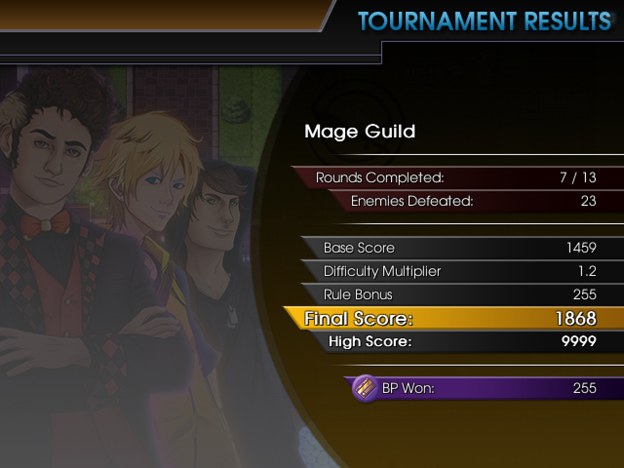 This is the latest version of the result screen, which still has improvements on the way. But not bad for what we've got so far, huh? Lots of math still needed for scores and BP won (which should be something along the lines of the following formula: