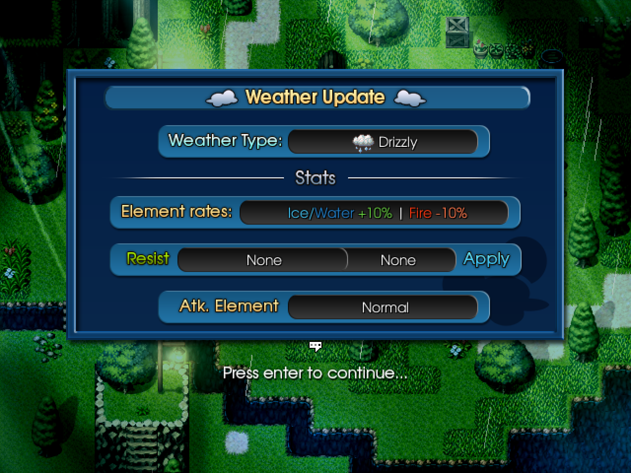 Weather now affects battle even deeper than visuals now. Now, a weather state will be applied in battle universally, to both party members and enemies, depending on the weather!